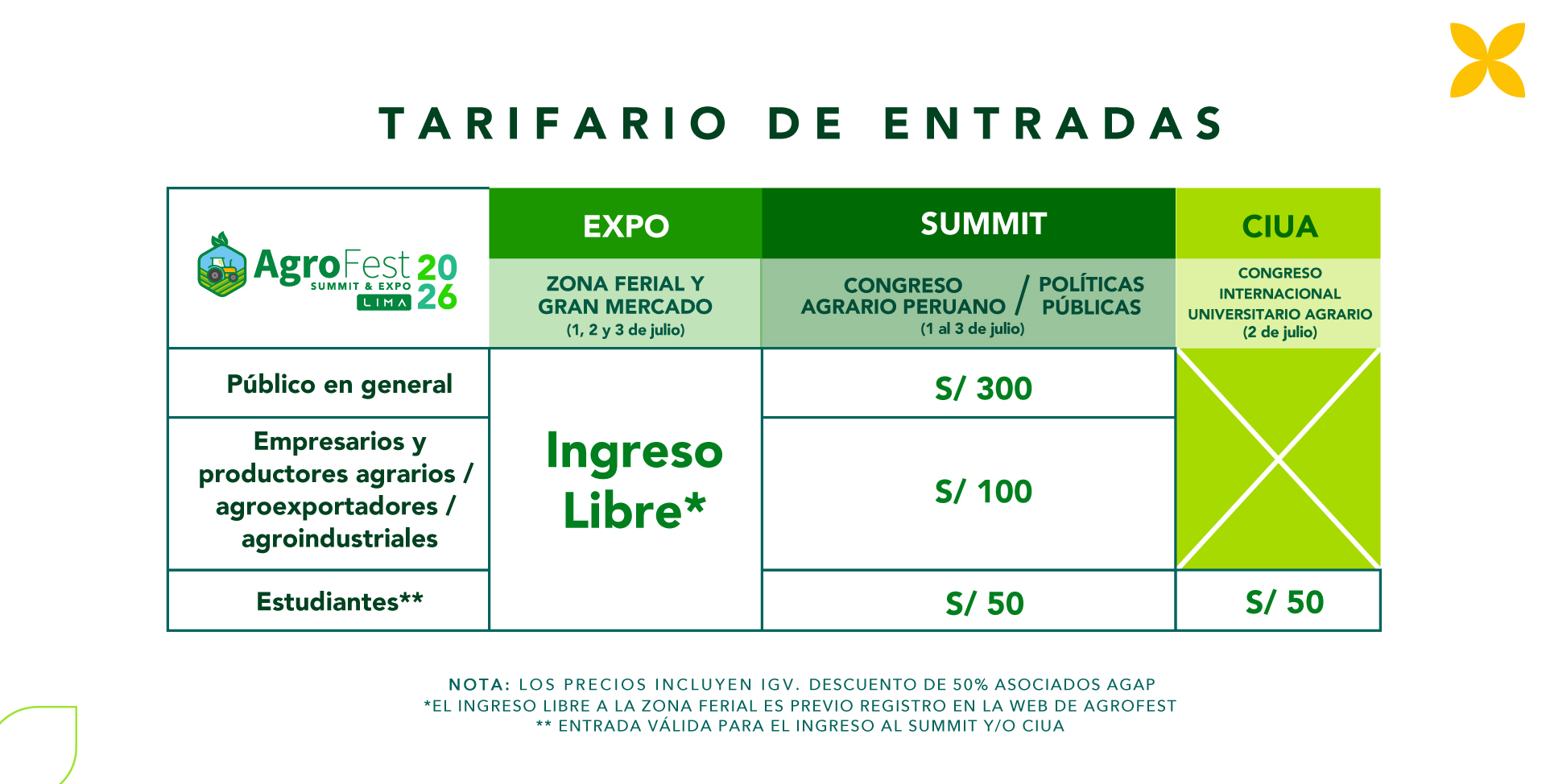 Se parte del AGROFEST 2026 donde conocerás a: líderes, expertos y visionarios del sector agrario peruano e internacional donde se reunirán para intercambiar conocimientos, compartir experiencias y co-crear soluciones innovadoras que impulsen el desarrollo sostenible del agro. Un espacio único para conectarte, inspirarte y transformar la manera en que entendemos y hacemos la agricultura del futuro.